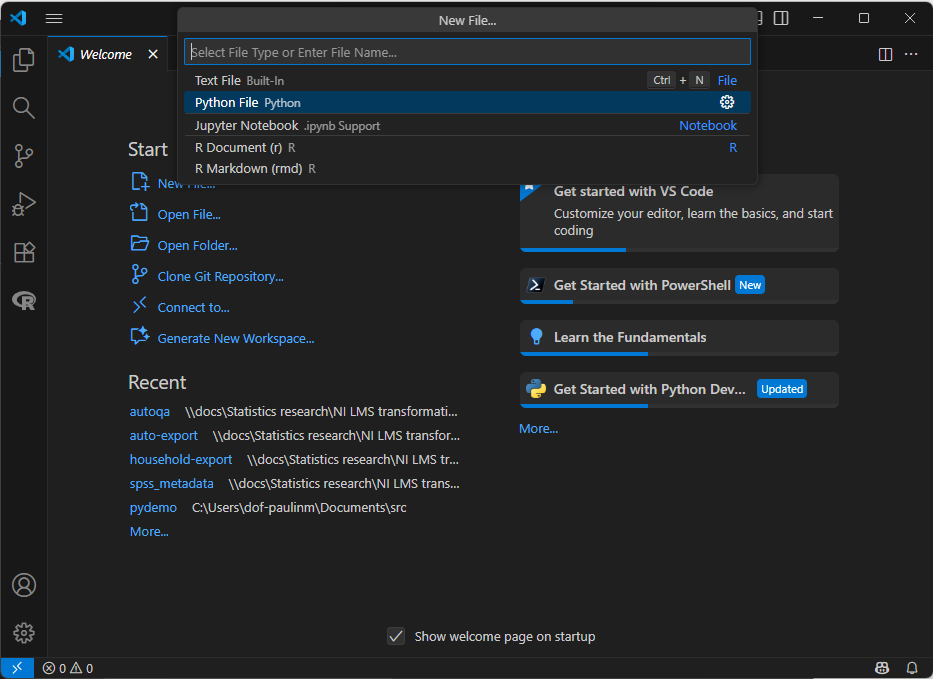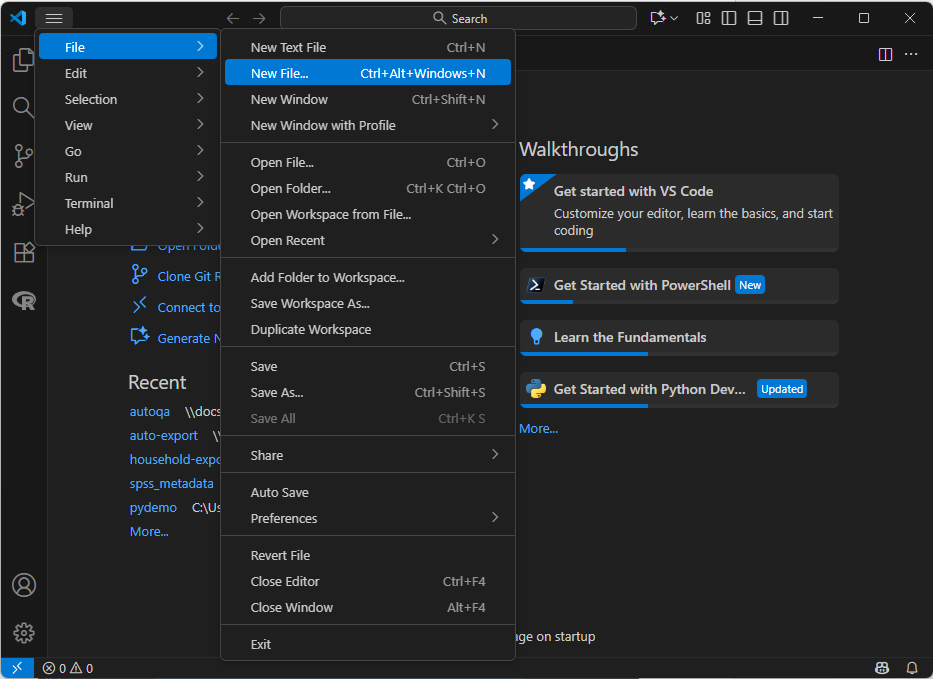 Close and reopen VS Code, then go to File > “New File…”, then pick “Python file” from the drop-down menu:
