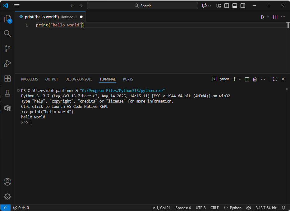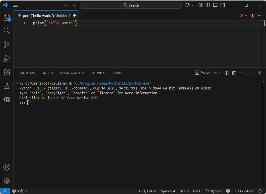 Open VS Code, go to the Extensions menu in the left-hand sidebar, search for “python”, select the “Python” extension published by Microsoft and install it: