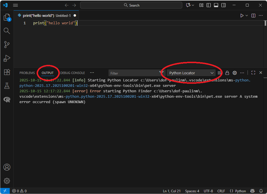 and open the “Output” tab. Go to the drop-down menu and pick “Python Locator” if it’s there. If it looks something like the screenshot below, double-check Python Locator under settings (it should be “js”), then try restarting VS Code again:
